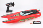 The SuperCat 700BL is fueled by brushless power that will have you flying across the water at adrenaline-pumping speeds of up to 40MPH! The SuperCat's growl is produced by a brushless, water-cooled 2000kV motor and controlled with a 40A water-cooled ESC that harnesses the energy output of the included 3S 3600mAh LiPo battery pack. This water rocket features a durable uni-body ABS hull that arrives pre-painted with a unique red matte finish with aggressive, colorful graphics that combine to give the SuperCat a powerfully elegant appearance. The durable stainless-steel propeller, rudder, and running hardware deliver the finishing touches to make the SuperCat a great looking, high-performance boat that you will be proud to own.